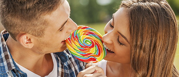 Lollipop fun. Young loving couple tasting multi colored lollipop